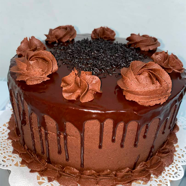 Consta de 3 masas sabor vainilla con 2 rellenos de crema bombón recubierta con crema bombón de mantequilla y decorada con chocolate fundido y sprinkles